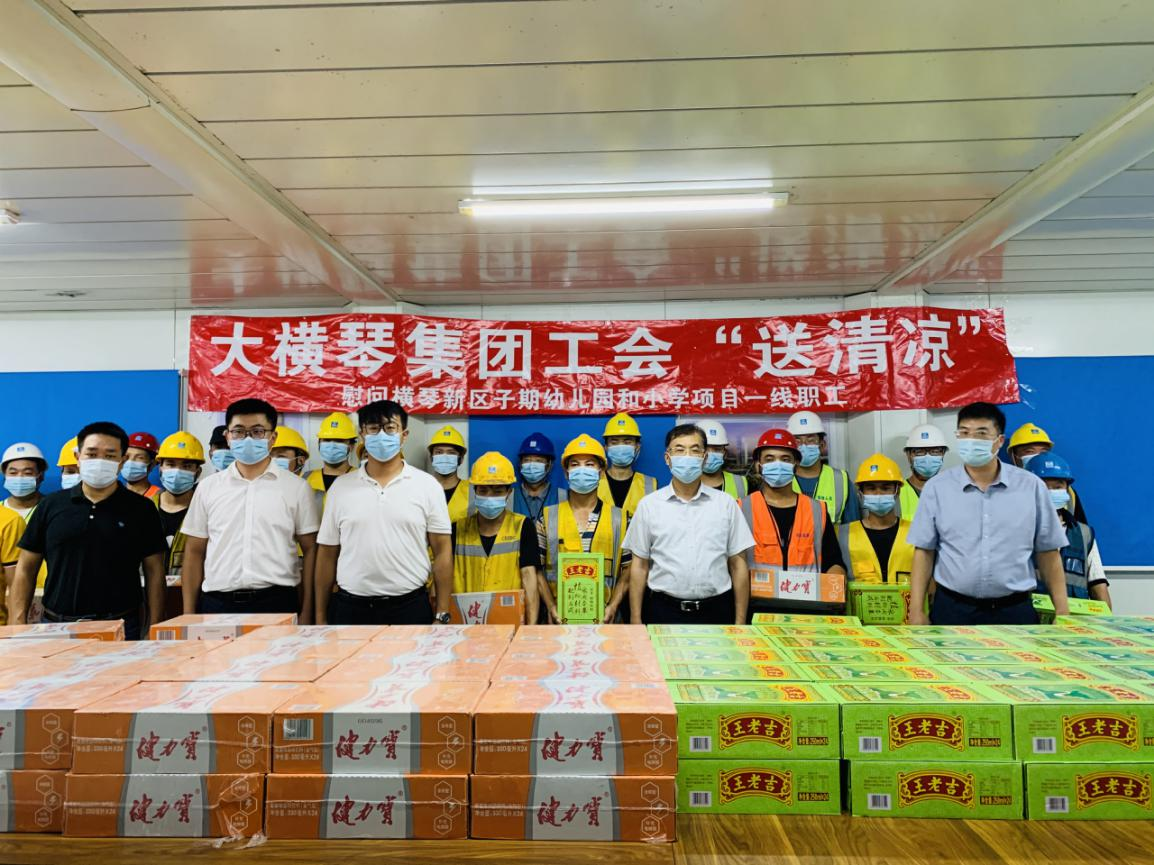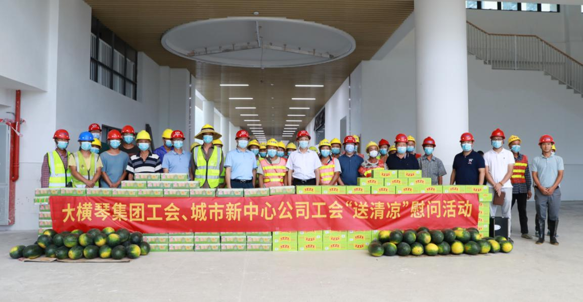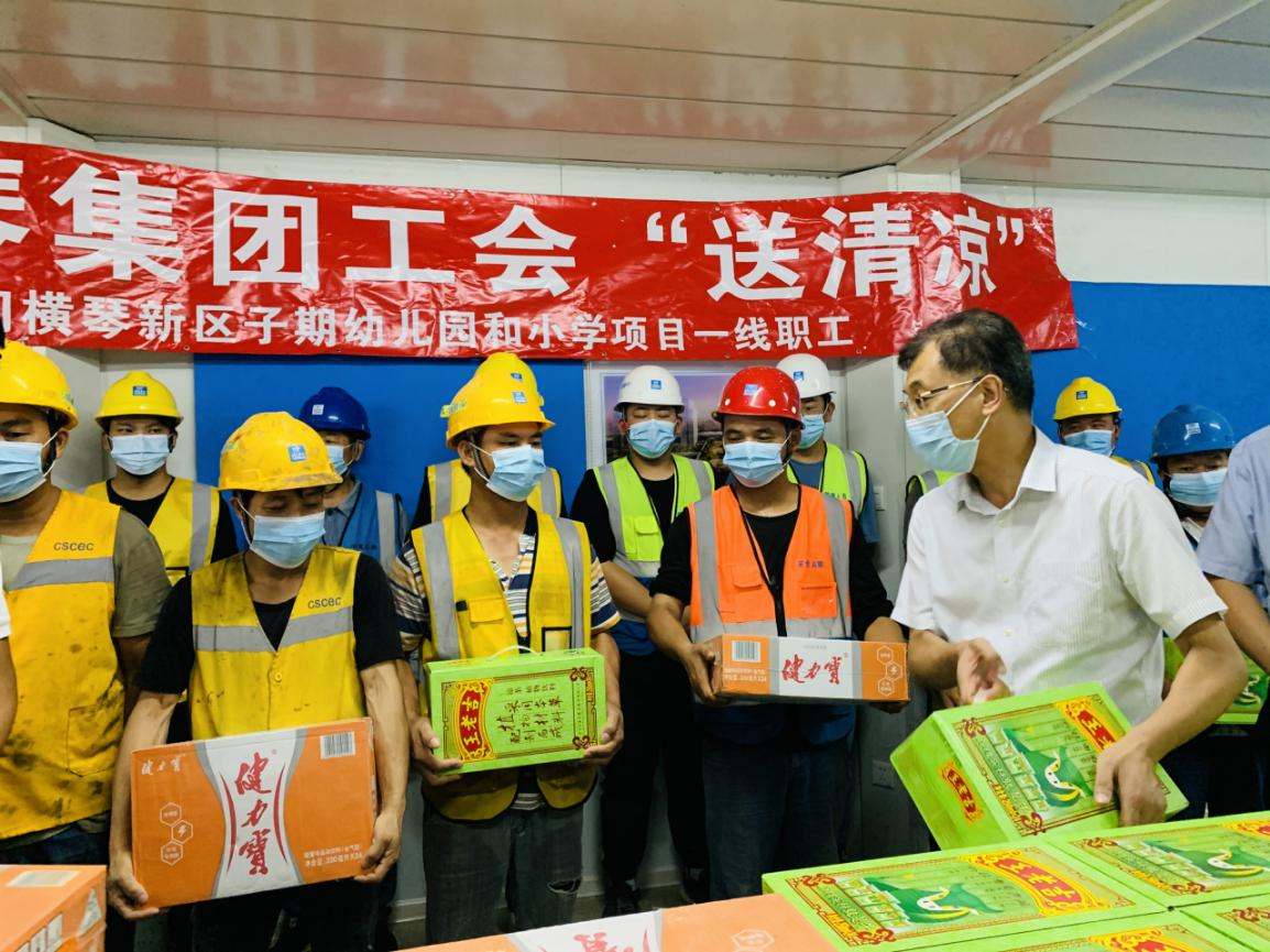 為進(jìn)一步加強高溫作業(yè)職工勞動保護(hù)工作,關(guān)愛堅守在項目一線的建設(shè)者,2021年7月,大橫琴集團(tuán)黨委書記、工會主席田偉帶隊分別赴科學(xué)城(二期)標(biāo)段一、標(biāo)段二項目、橫琴醫(yī)院項目、橫琴新區(qū)子期幼兒園和小學(xué)及保稅一小工程項目開展夏日送清涼慰問活動。