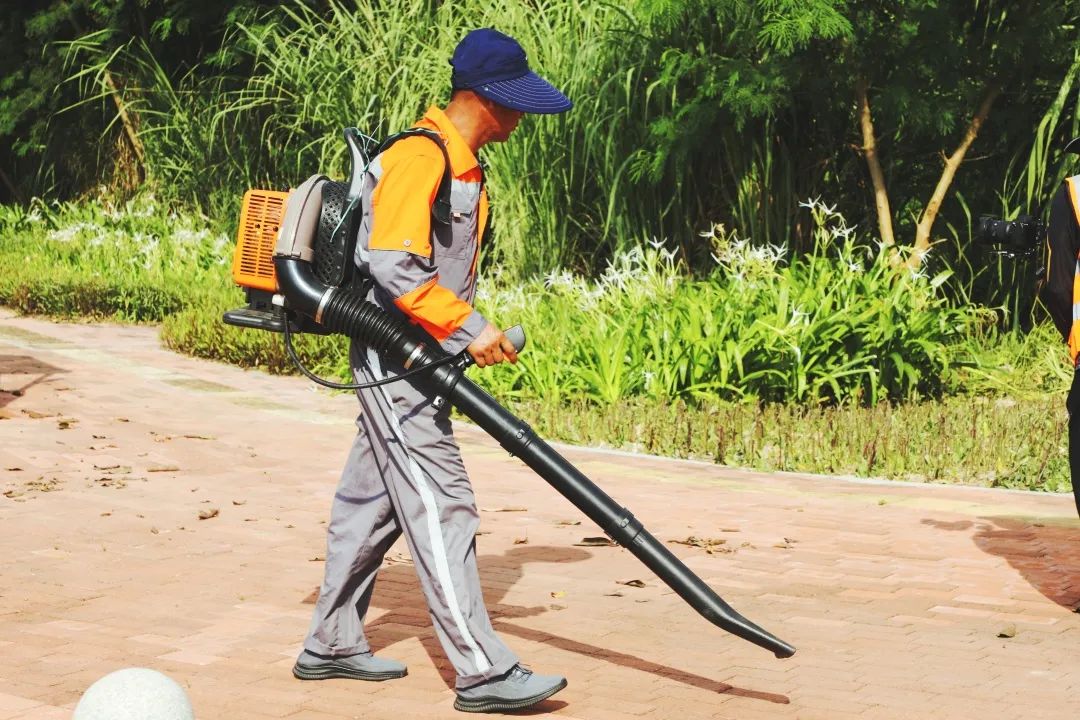 綠化工使用鼓風(fēng)機(jī)將垃圾吹至人行道