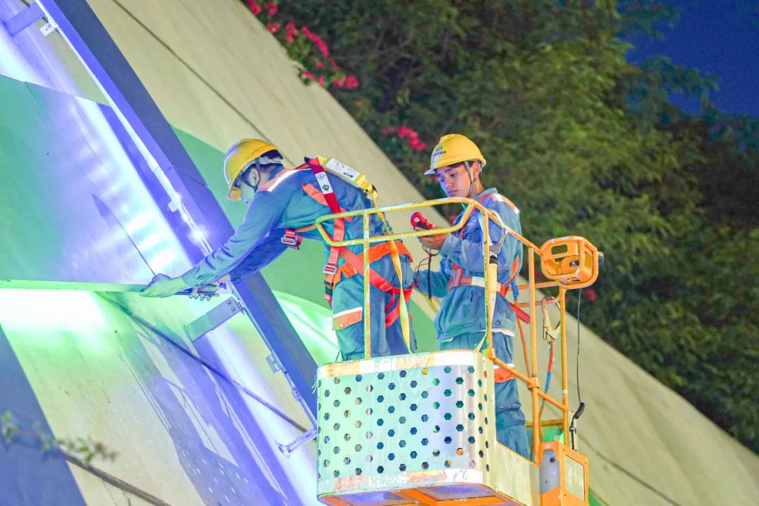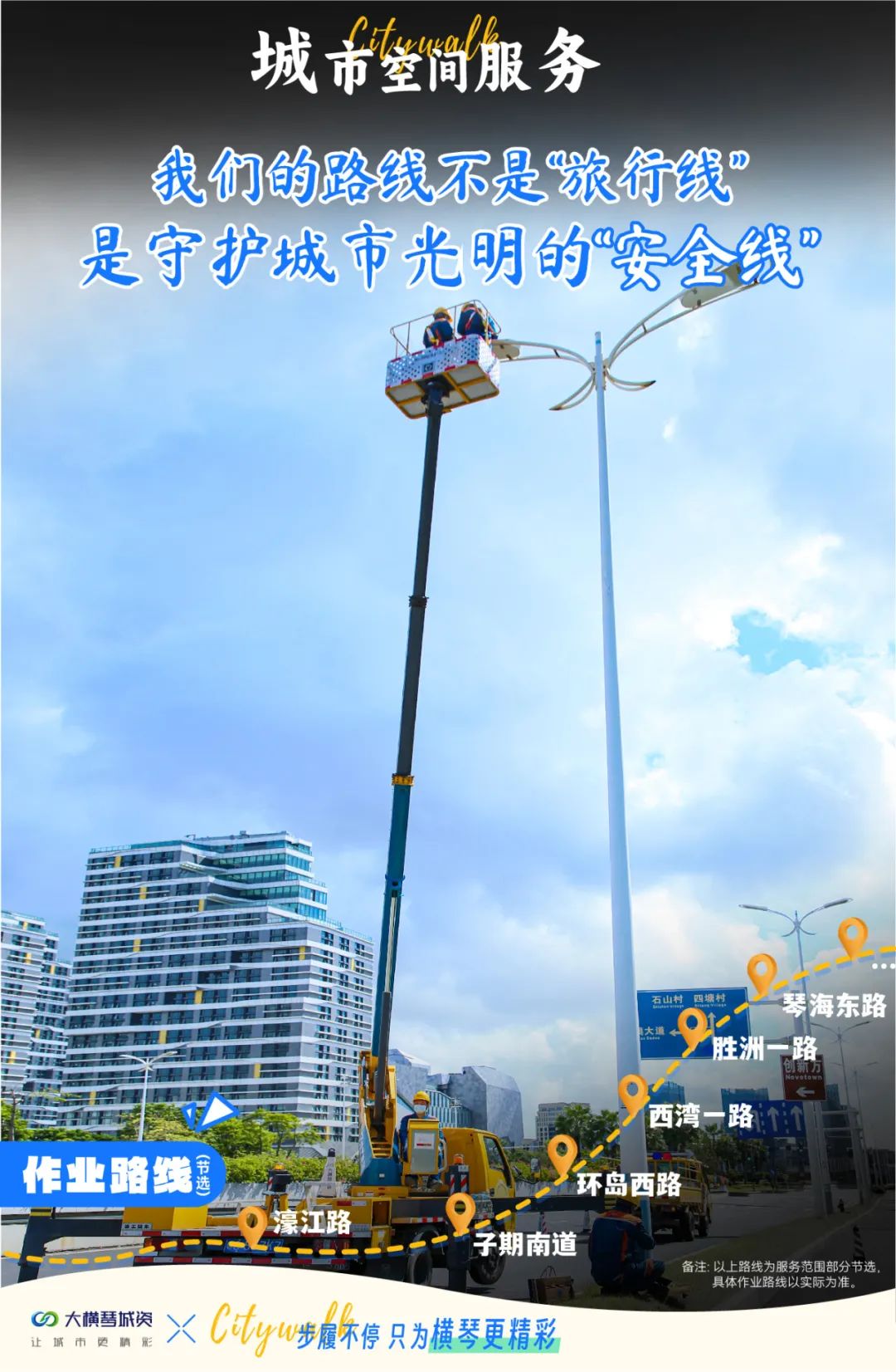 每當(dāng)夜幕降臨,一盞盞明亮的路燈、一處處別致的亮化景觀,勾勒出了合作區(qū)秀美的輪廓,市民游客在城市街頭Citywalk,他們則在城市高空,2萬余盞路燈、2萬多盞景觀燈,碼頭、立交、橋梁等景觀亮化燈光......都有他們的空中身影,陽光直射之下,腳站高空檢修,暴雨臺(tái)風(fēng)過后,更是以最快速度搶修,他們熟悉橫琴每一盞燈的“脾性”,他們默默守護(hù)著城市每個(gè)角落的光明。
