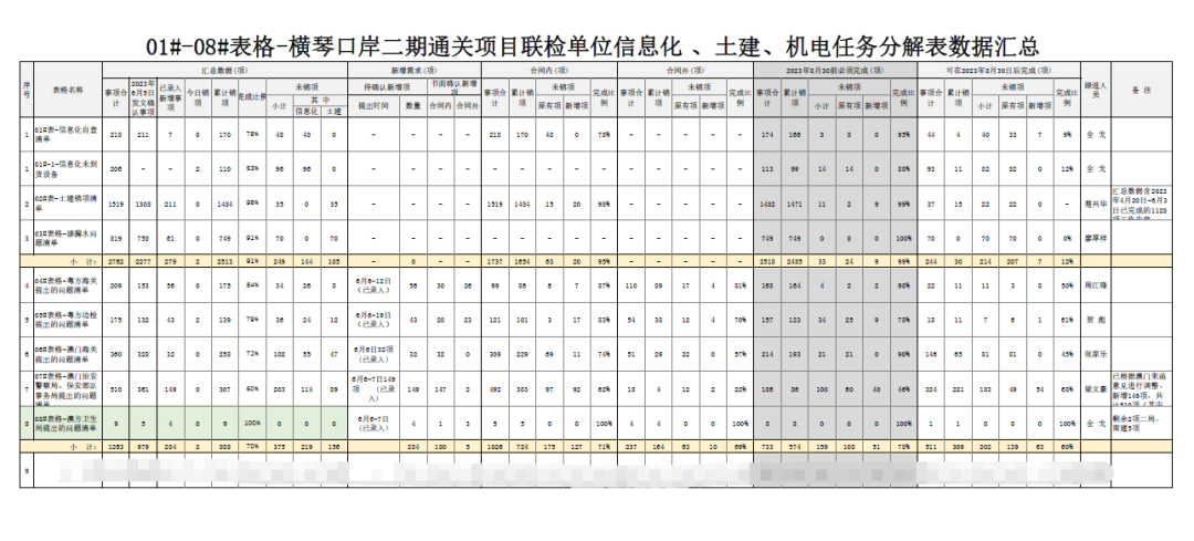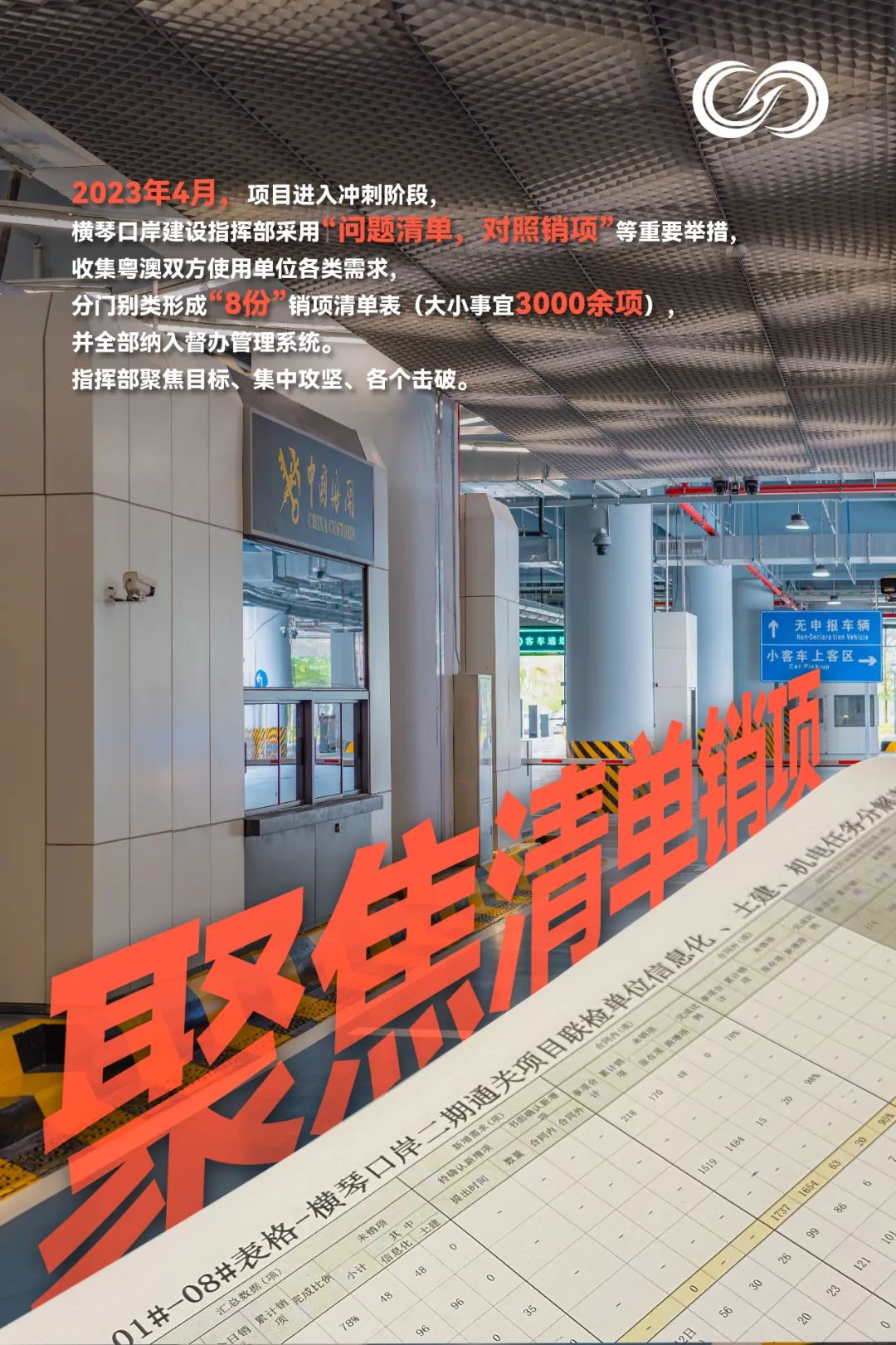 八是清單銷項(xiàng)??诎吨笓]部延續(xù)“5+2”、“白+黑”的工作模式,解決現(xiàn)場(chǎng)推進(jìn)過(guò)程中遇到的實(shí)際問(wèn)題,確保問(wèn)題不過(guò)夜。沖刺階段,更是堅(jiān)持每天下午17:00組織參建單位召開工作協(xié)調(diào)推進(jìn)會(huì),重點(diǎn)梳理土建工程、信息化工程剩余工作推進(jìn)情況、材料設(shè)備到場(chǎng)情況、質(zhì)量問(wèn)題整改情況等,形成8份銷項(xiàng)表,包括粵方海關(guān)、粵方邊檢、澳方海關(guān)、澳方邊檢、澳方衛(wèi)生局等需協(xié)調(diào)解決的問(wèn)題,實(shí)行“問(wèn)題清單銷項(xiàng)督辦”的機(jī)制,要求各責(zé)任人“鎖定需求、對(duì)表作戰(zhàn),對(duì)照銷項(xiàng)”。據(jù)統(tǒng)計(jì),梳理大小問(wèn)題多達(dá)3000余項(xiàng)。
