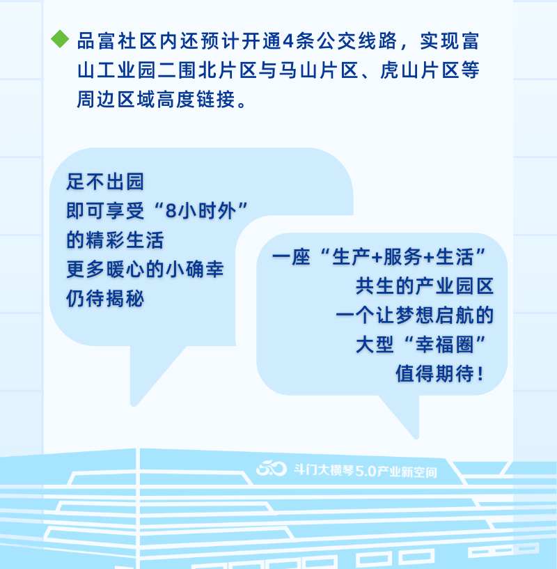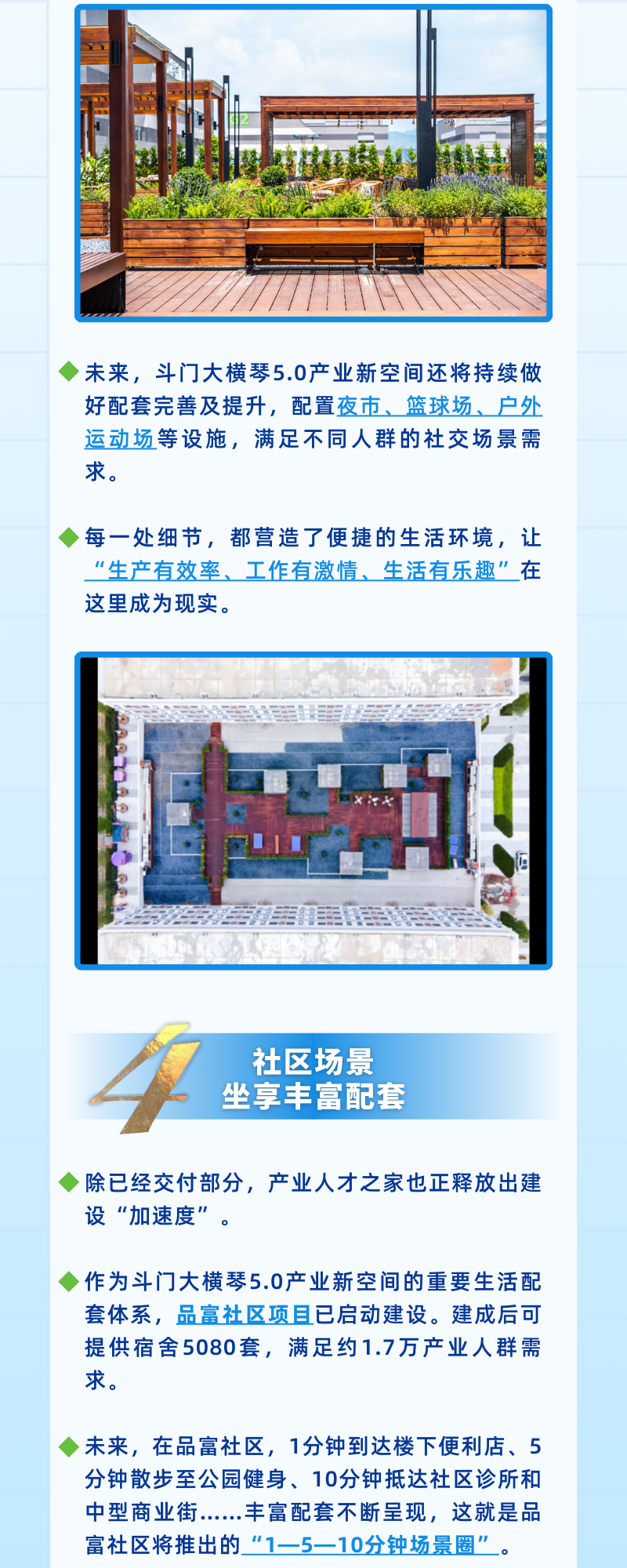新空間,托起產(chǎn)業(yè)新夢想。作為一座能“拎機投產(chǎn)”“拎包入住”的高質(zhì)量園區(qū),斗門大橫琴5.0產(chǎn)業(yè)新空間不僅適應(yīng)新形勢、賦能新技術(shù)、承載新產(chǎn)業(yè),還配備能滿足員工吃、住、娛樂休閑等需求的生活、商業(yè)配套。