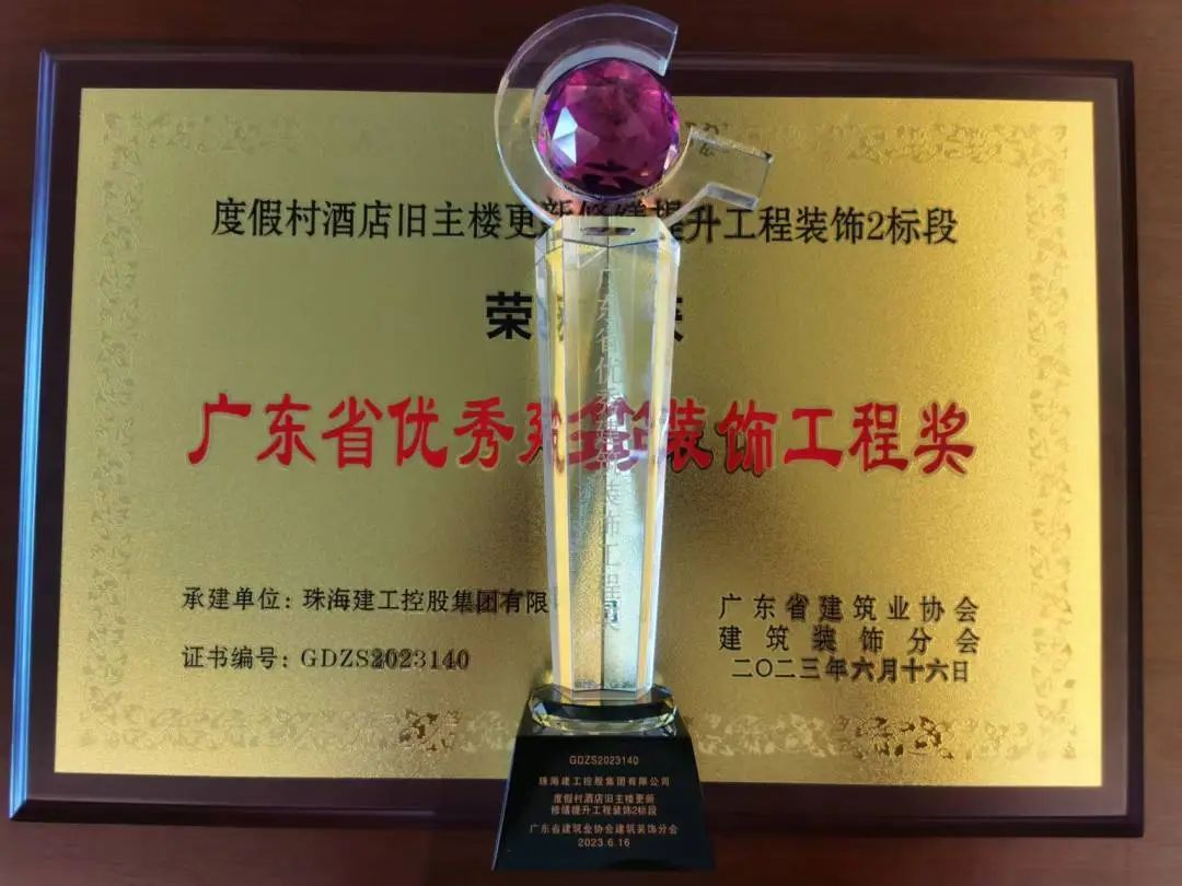度假村酒店舊主樓更新修繕提升工程裝飾2標段榮獲全國建筑工程裝飾獎、廣東省優(yōu)秀建筑裝飾工程獎、珠海市優(yōu)秀建筑裝飾工程獎。