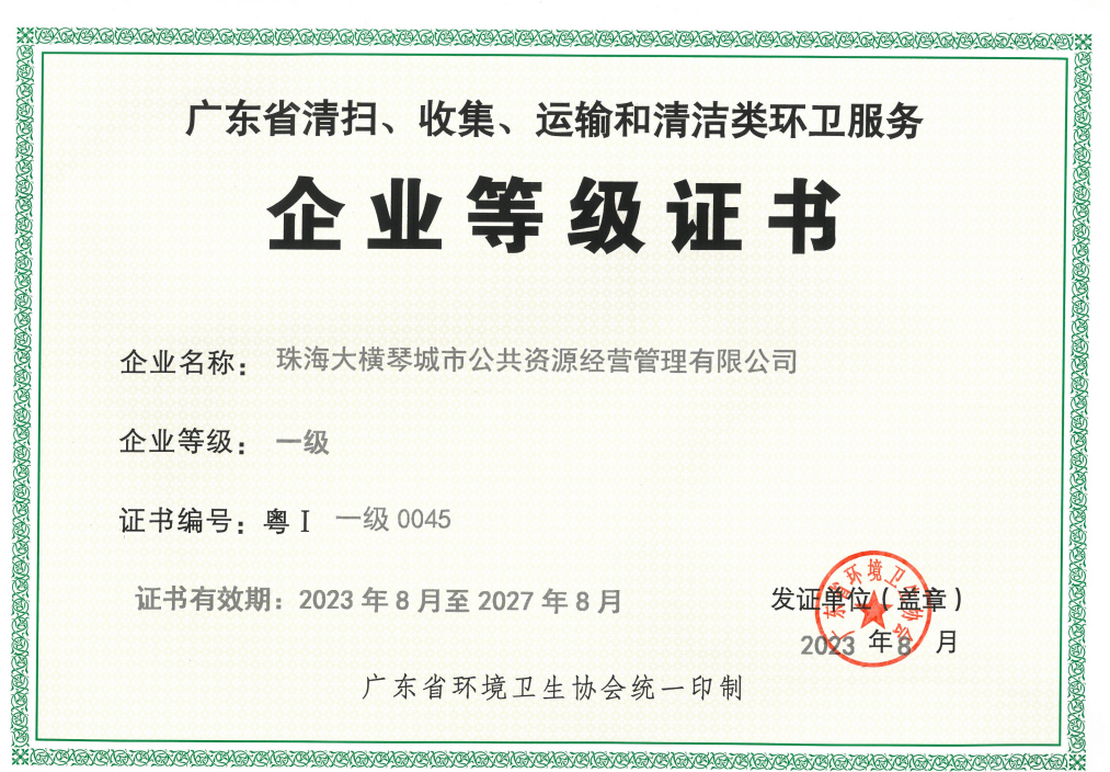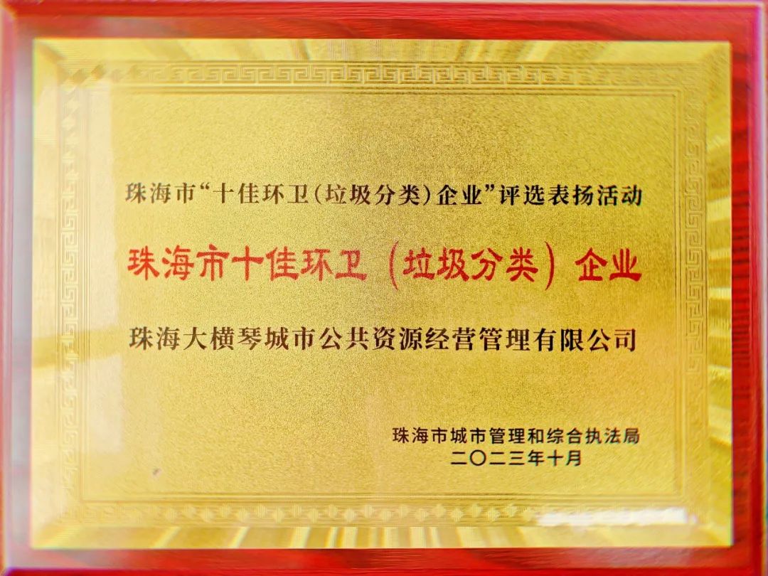 2023年,大橫琴城資榮獲“廣東省清掃、收集、運(yùn)輸和清潔類環(huán)衛(wèi)服務(wù)企業(yè)”一級評定和珠海市“十佳環(huán)衛(wèi)(垃圾分類)企業(yè)”稱號。