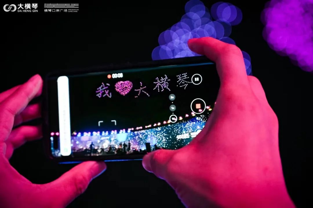 當(dāng)晚,橫琴口岸正上空,還演繹了一場點亮夜空、打破傳統(tǒng)的星空大秀。一架架無人機排著整齊的隊列,在夏日的夜空里亮起了點點星光。機群盤旋上升匯聚,在空中先后編織出“我愛橫琴”、“25”、“金蓮花”等一個個絢麗的方陣,在夜空中留下了一個個美好的祝福,而在場的觀眾也隨著無人機方陣的變化,許下對琴澳協(xié)同發(fā)展的美好期許。