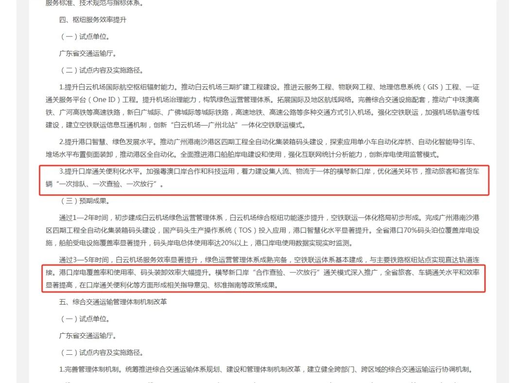 預(yù)期通過3—5年時(shí)間,實(shí)現(xiàn)白云機(jī)場(chǎng)服務(wù)效率顯著提升,綠色運(yùn)營(yíng)管理體系成熟完備,空鐵聯(lián)運(yùn)體系基本建成,與主要鐵路樞紐站點(diǎn)實(shí)現(xiàn)直達(dá)軌道連接;港口岸電覆蓋率和使用率、碼頭裝卸效率大幅提升;橫琴口岸“合作查驗(yàn)、一次放行”通關(guān)模式深入推廣,全省旅客、車輛通關(guān)水平和效率顯著提高,在口岸通關(guān)便利化等方面形成相關(guān)指導(dǎo)意見、標(biāo)準(zhǔn)指南等政策成果。