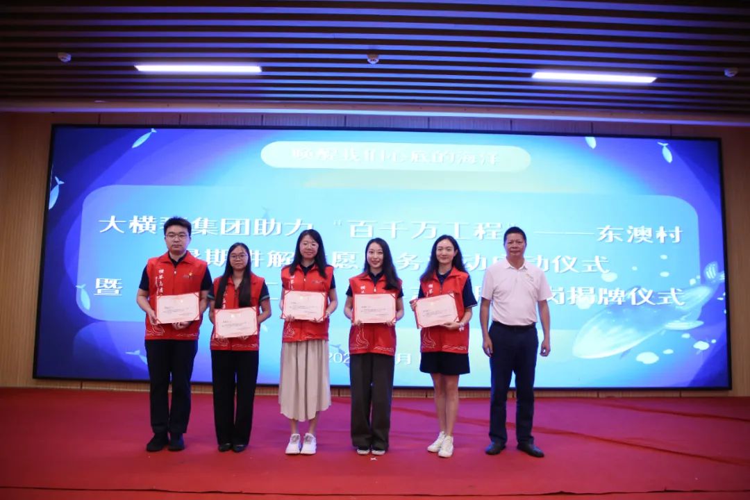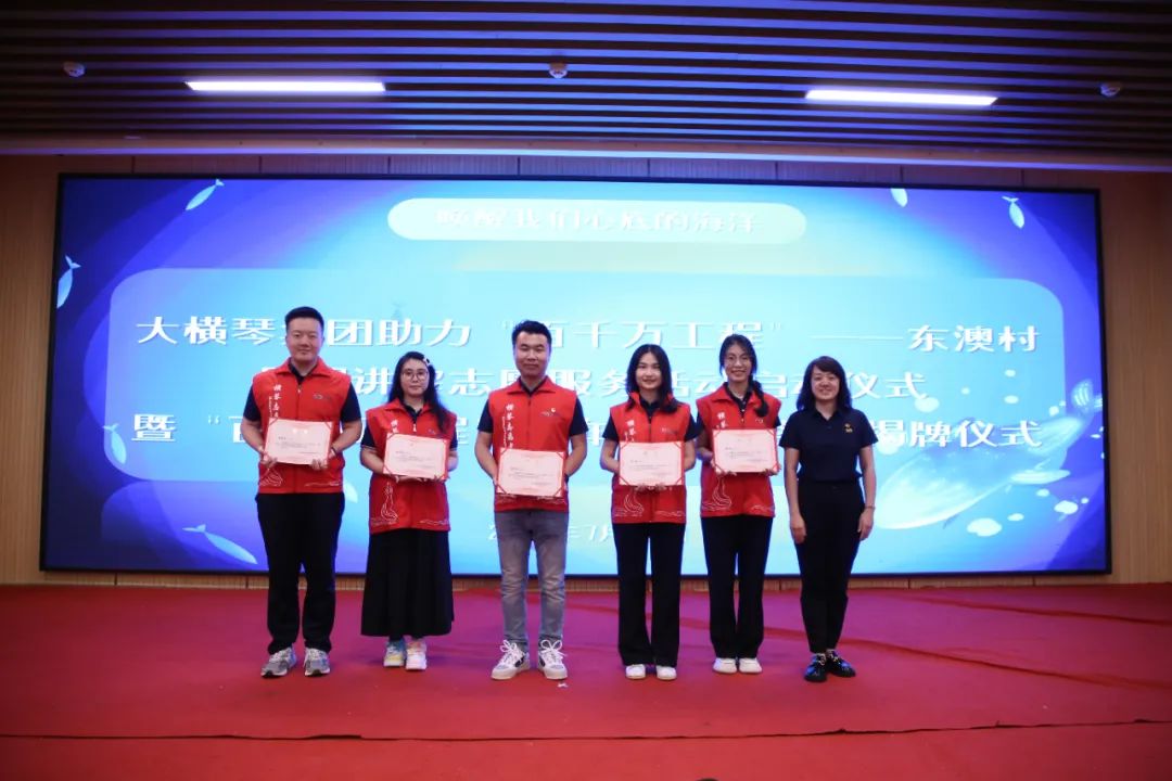 儀式上,共青團珠海市委員會權益與社會工作部部長王臻,珠海市萬山鎮(zhèn)人民政府黨委副書記、鎮(zhèn)長黃軒流,珠海大橫琴集團有限公司黨委副書記戴碩濤,珠海市萬山鎮(zhèn)東澳村書記石志明,萬山海洋生物科普館館長安東共同為“百千萬工程”青年志愿服務崗揭牌,啟動助力“百千萬工程”——東澳村暑期講解志愿服務活動。