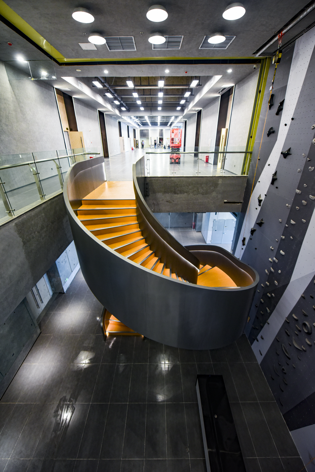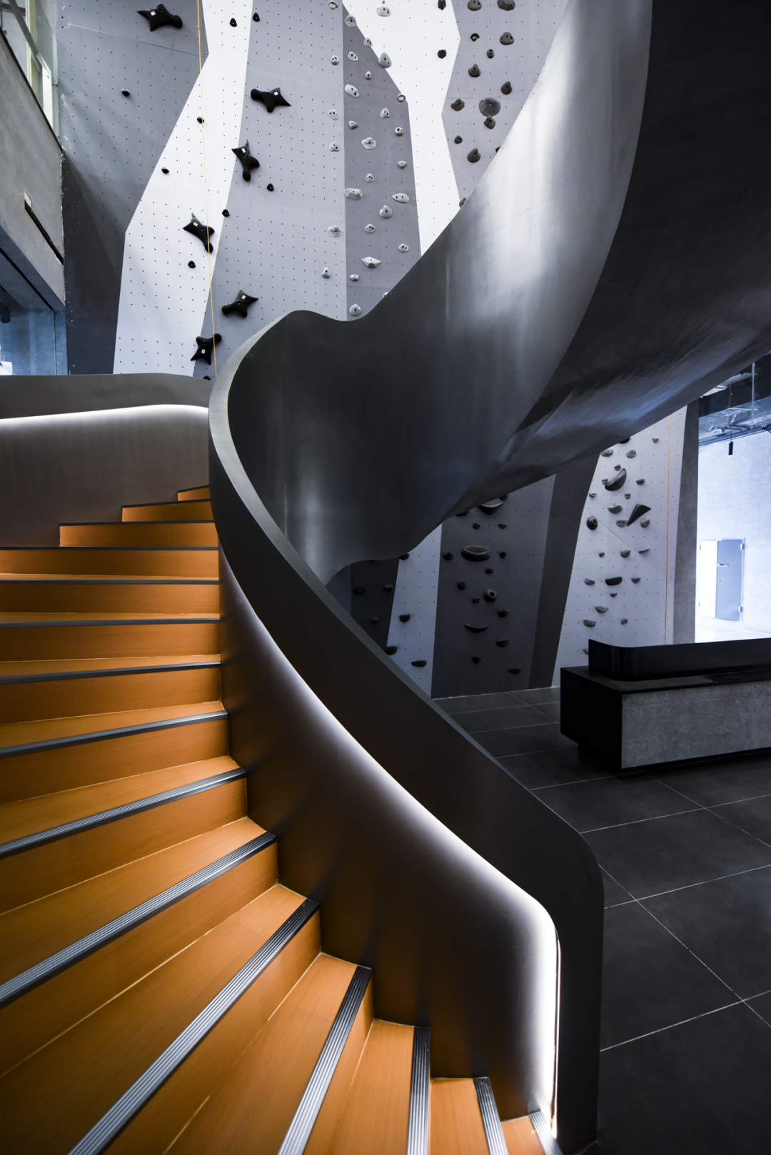 11樓設(shè)置了多功能室(可容納300人)、大小會議室、洽談室等,中庭與12樓相通,設(shè)置了旋轉(zhuǎn)樓梯和攀巖墻,寓意企業(yè)步步高升,體現(xiàn)企業(yè)家永攀高峰的精神。12樓主要以企業(yè)服務(wù)區(qū)、會客室為主。