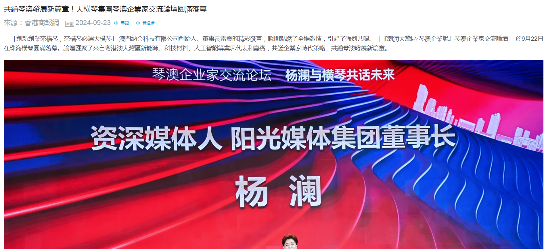 此次論壇由橫琴粵澳深度合作區(qū)(以下簡稱:合作區(qū))經(jīng)濟(jì)發(fā)展局支持,大橫琴集團(tuán)、叡智蓮花公關(guān)服務(wù)有限公司聯(lián)合主辦,是繼「潮湧大灣區(qū)·澳門青年說」論壇後,大橫琴集團(tuán)再次攜手資深媒體人、陽光媒體集團(tuán)董事長楊瀾女士,匯聚來自粵港澳大灣區(qū)新能源、科技材料、人工智能等各行各業(yè)共500多位代表和嘉賓,共議企業(yè)家時代策略,共繪琴澳發(fā)展新篇章。