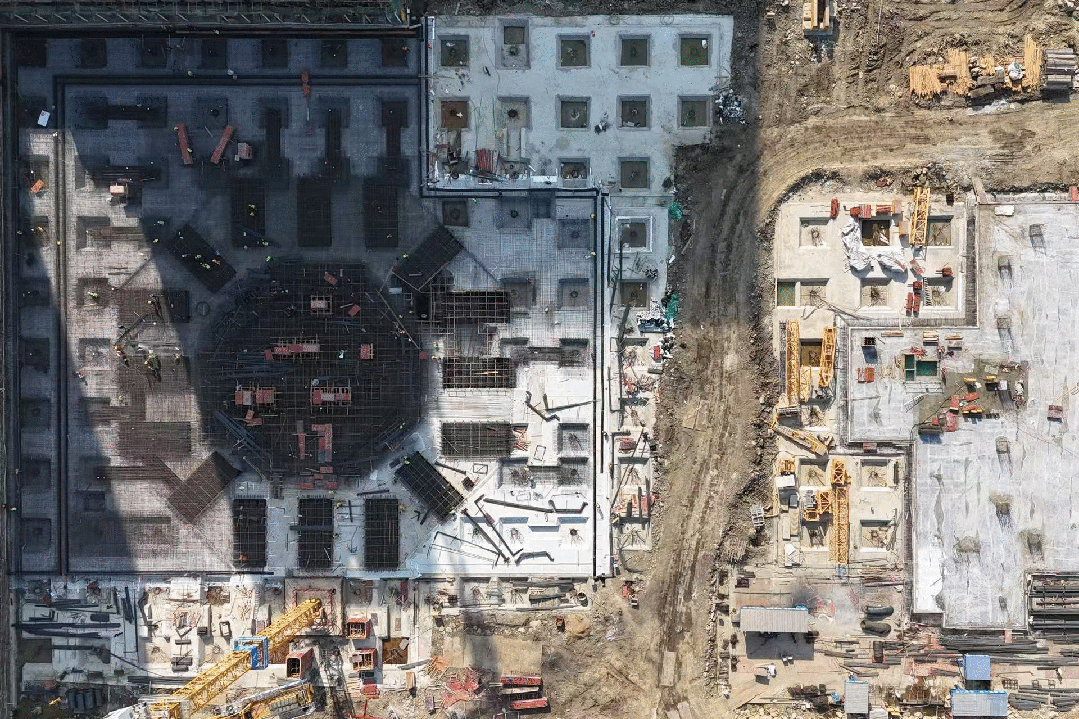 橫琴科學城(三期)項目工程特色鮮明、建設(shè)規(guī)模大、技術(shù)要求高、重點難點多,本次澆筑的K2棟底板大體積混凝土,是項目諸多技術(shù)重點難點中首個正式實施的。K2棟塔樓建筑高度149m,塔樓區(qū)域底板面積約4700㎡,底板厚度1.8m,承臺厚度3.8m,核心筒局部最深7.34m,鋼筋用量約1100t,混凝土約10000m3。本次混凝土澆筑量約1250車,投入5臺泵車“多管齊下”,歷時72小時,這是一次對專業(yè)技術(shù)和施工組織的雙重考驗。