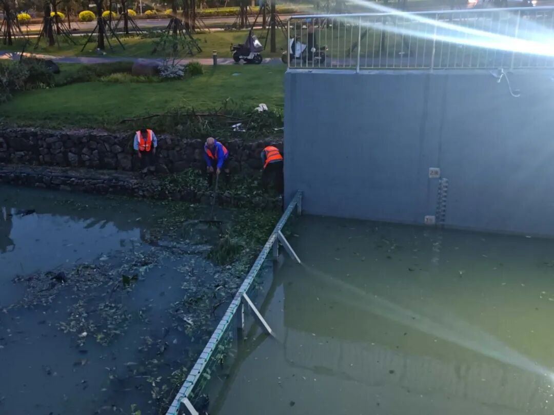 臺(tái)風(fēng)期間,受風(fēng)暴潮影響,橫琴天沐河水位上漲,珠光集團(tuán)迅速組織搶險(xiǎn)力量,通過(guò)加筑沙袋有效阻止海水倒灌進(jìn)天沐河,同步安全轉(zhuǎn)移設(shè)備設(shè)施,并緊急安裝抽水設(shè)備清理積水,避免變電房被水浸泡。臺(tái)風(fēng)過(guò)境后,搶險(xiǎn)隊(duì)伍立即投入后續(xù)清理工作,第一時(shí)間清理泵站進(jìn)水口垃圾,保障泵站排水通暢,降低村渠水位;清理排水口垃圾,保障土渠排水暢通;并全力協(xié)助合作區(qū)市政管理署,清理倒塌的邊境圍網(wǎng)。