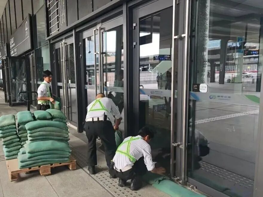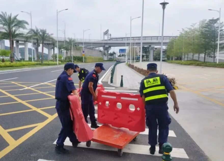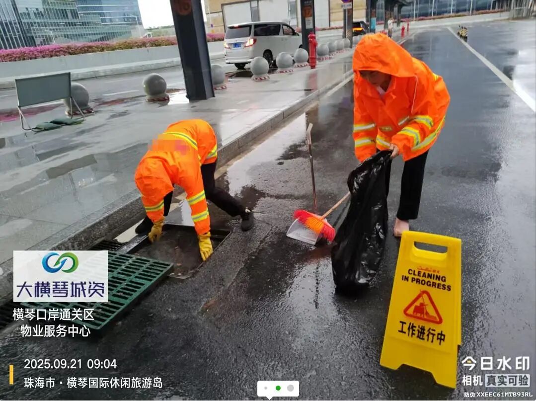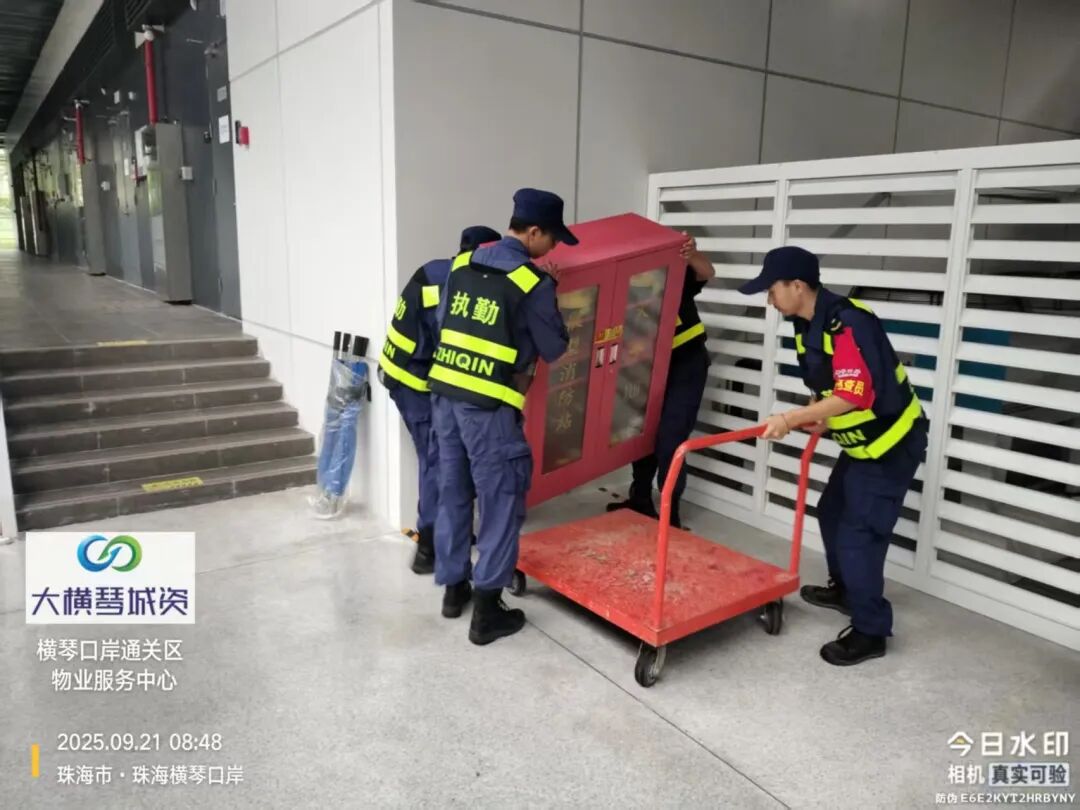 在橫琴口岸區(qū)域,提前排查200多個集水井,調(diào)集230個緊固件加固門窗,近3000條沙袋、近100個防洪擋板、11臺水泵等應(yīng)對福臨道、地庫36處接駁口、負(fù)二層下沉庭院、U行車道等重點(diǎn)區(qū)域強(qiáng)排和封堵需要。同時對通關(guān)區(qū)域的100余扇玻璃門進(jìn)行加固,在易水浸區(qū)域放置沙袋、擋板。同時,全面清理雨水井、排水溝渠,確保排水暢通。