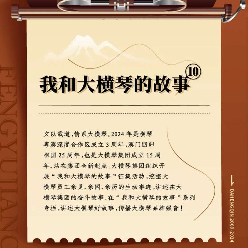 文以載道,情系大橫琴。2024年是橫琴粵澳深度合作區(qū)成立3周年,澳門回歸祖國25周年,也是大橫琴集團(tuán)成立15周年。站在集團(tuán)全新起點,大橫琴集團(tuán)組織開展“我和大橫琴的故事”征集活動,挖掘大橫琴員工親見、親聞、親歷的生動事跡,講述在大橫琴集團(tuán)的奮斗故事。大橫琴集團(tuán)公眾號將陸續(xù)推出“我和大橫琴的故事”系列專欄,講述大橫琴好故事,傳播大橫琴品牌強(qiáng)音!